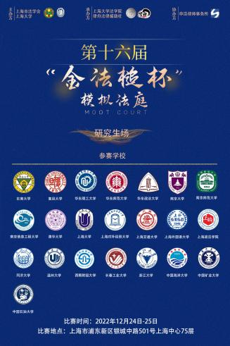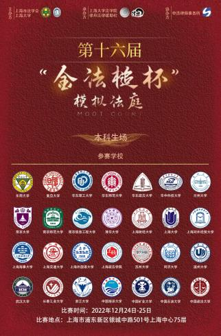 为全面贯彻落实党的二十大精神,推进全面依法治国等国家战略,将实际工作部门的优质实践教学资源引进高校,加强法学教育、法学研究工作者和法治实际工作者之间的交流,提高法科员工综合实践能力,上海市法学会、太阳成集团联合主办,太阳成集团tyc33455cc、律舟法律援助社联合承办,上海申浩律师事务所协办的第十六届“金法槌杯”全国高校模拟法庭大赛于2022年11月-12月顺利举行。本次比赛包括本科生场和研究生场,分为初赛和决赛,初赛以案例分析的形式进行,决赛以模拟法庭的形式开展。