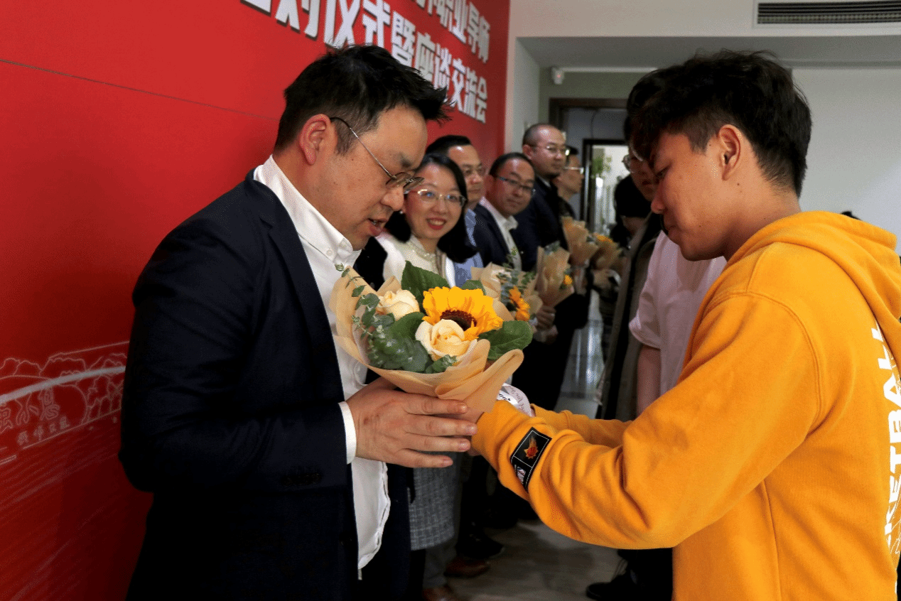 校外职业导师与员工结对仪式上,徐国明书记向校外职业导师授予院徽,结对员工代表向校外职业导师献花。