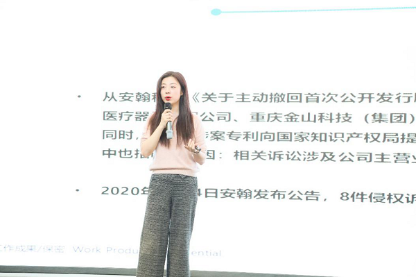紫藤知识产权集团华东区域总监燕菁菁就“科创板上市后备企业知识产权运营管理”发表了主旨演讲。燕菁菁总监首先简单阐述了企业科创板上市的相关规定和规则,然后从实践案例入手,向大家分享了安翰科技、博拉网络、深圳传音、苏州敏芯、成都极米科技、成都纵横等案例,揭示了企业上市前期专利诉讼阻击对企业上市的影响,提出企业继受取得专利的数量和比例可能会影响上市委对企业科创属性的认定,并建议企业可在上市前针对自己有侵权风险的专利提前进行无效证据搜集,进而能够在上市过程中遇到诉讼时及时进行应对和反击。燕菁菁总监最后还介绍了一些企业的知识产权管理预案和IPO企业辅导案例,并提出了宝贵建议。